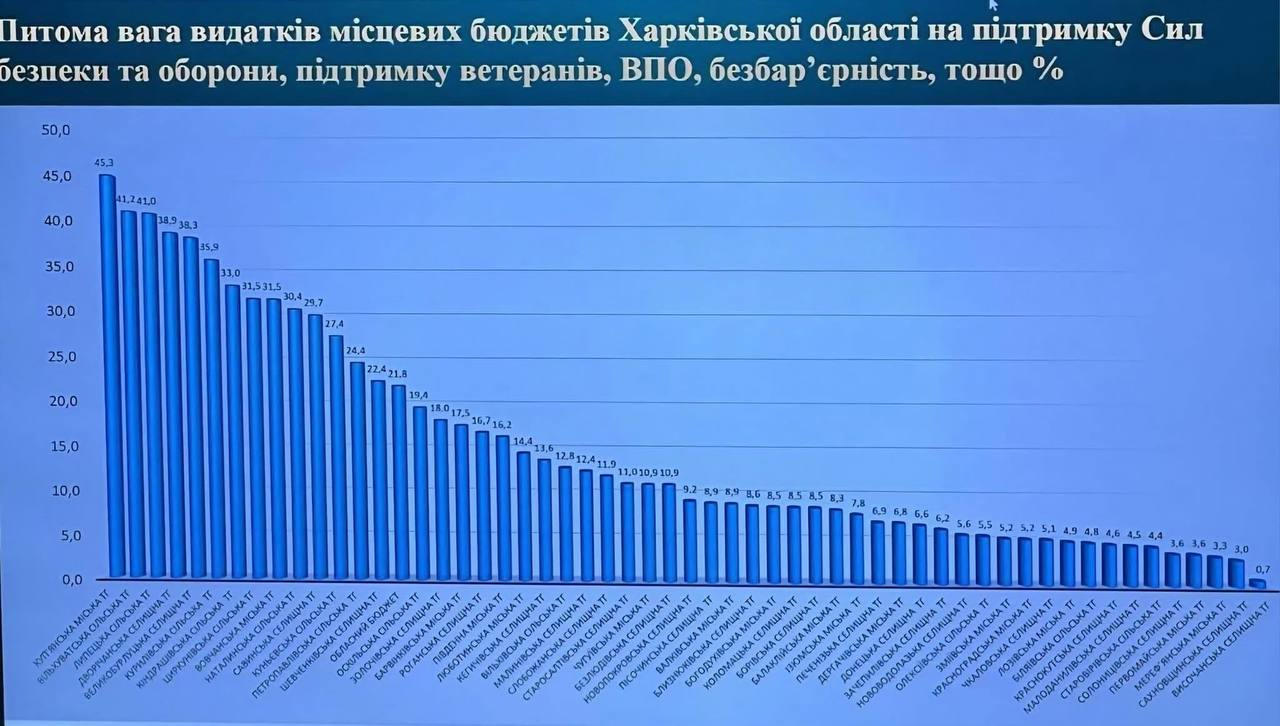 Процент бюджета громад, направленный на ВСУ, в Харьковской области различается в разы.