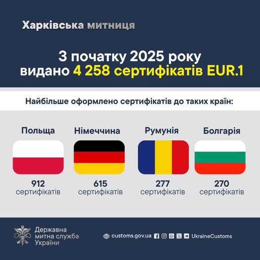 По данным таможенников, с начала 2025 года Харьковская таможня выдала 4258 сертификатов EUR.1, позволяющих украинским товарам без пошлины попадать на рынки ЕС, Великобритании, Израиля и других стран-партнеров.