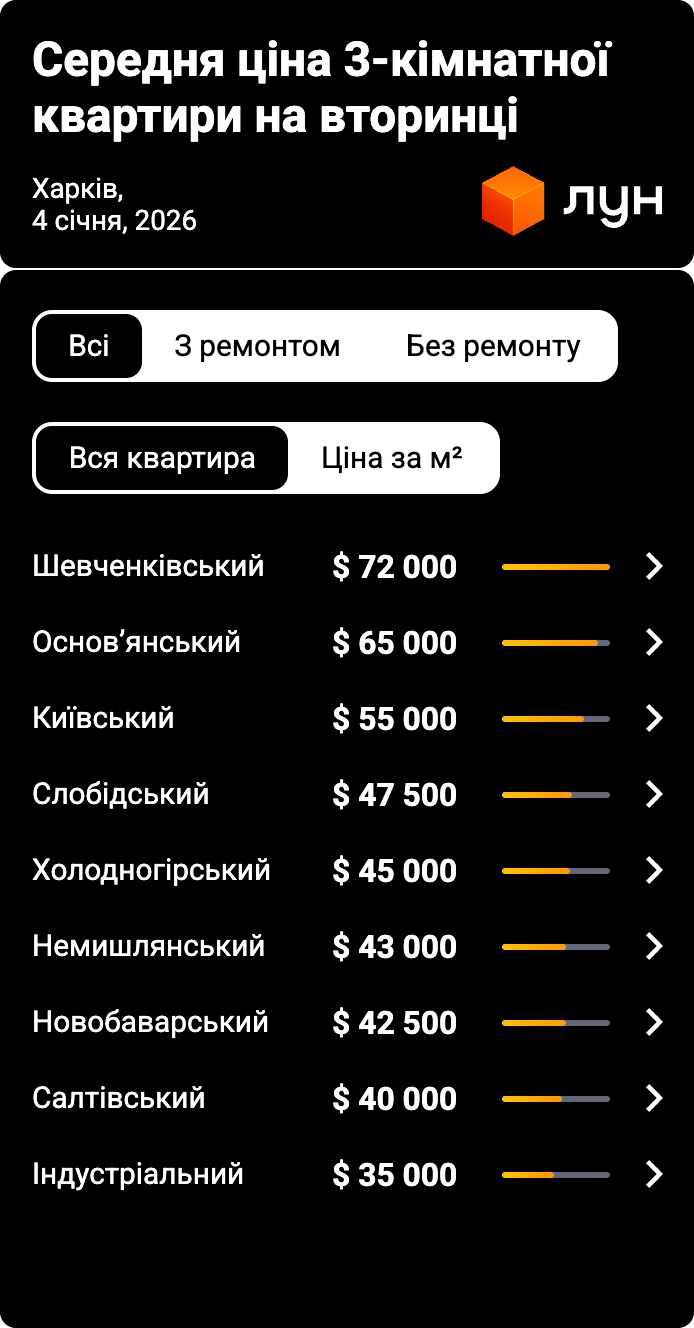 По данным платформы, к началу января вторичный рынок жилья Харькова демонстрирует четкое разделение между районами-лидерами и аутсайдерами по ценам на квартиры.
