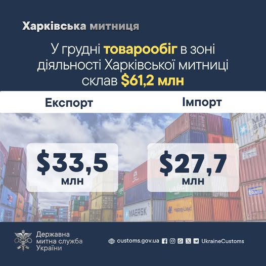 По данным таможенников, товарооборот Харьковской таможни в декабре 2025 составил $61,2 млн.