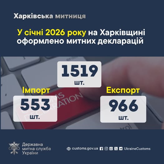 В январе 2026 года Харьковская таможня оформила 1519 таможенных деклараций, большинство из которых экспортные.