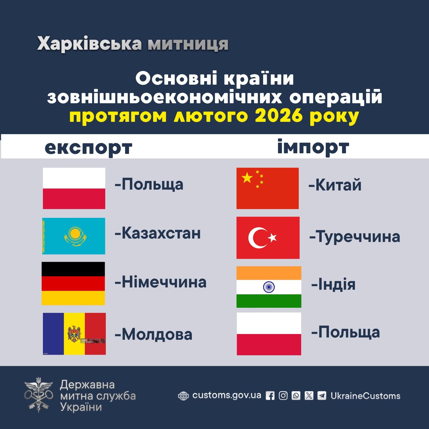 Харьковская таможня назвала главные страны экспорта и импорта в феврале 2026 года