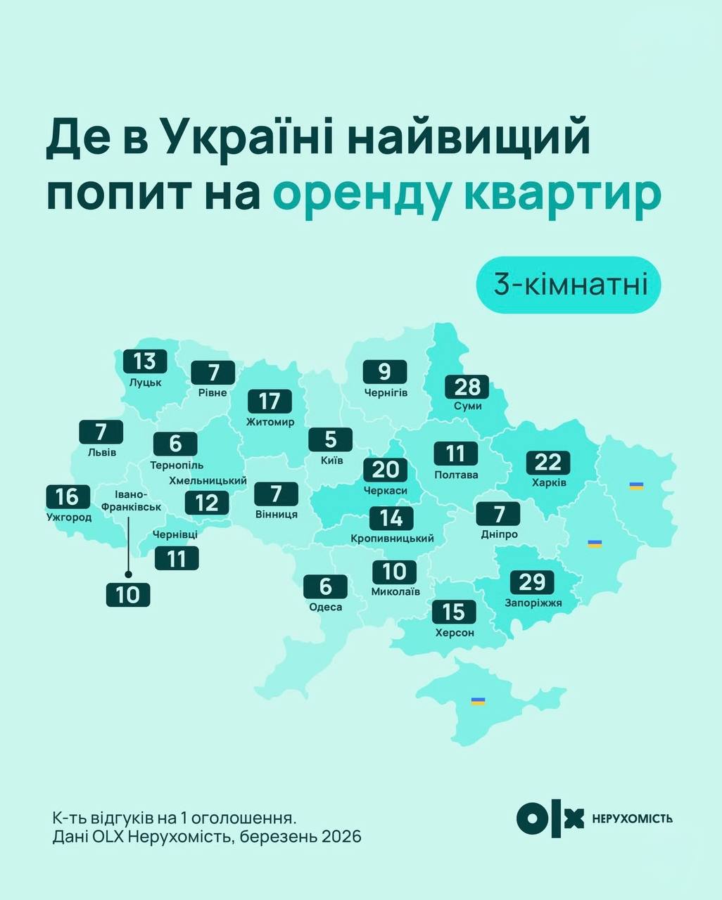 По данным платформы, рынок аренды в Харькове разогревается нешуточно. По данным аналитиков OLX Недвижимость, по количеству отзывов на одно объявление город оказался в лидерах вместе с Запорожьем.