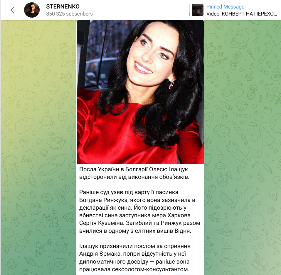 Посла Украины в Болгарии Олесю Илащук, пасынка которого подозревают в убийстве сына заместителя мэра Харькова, отстранили.