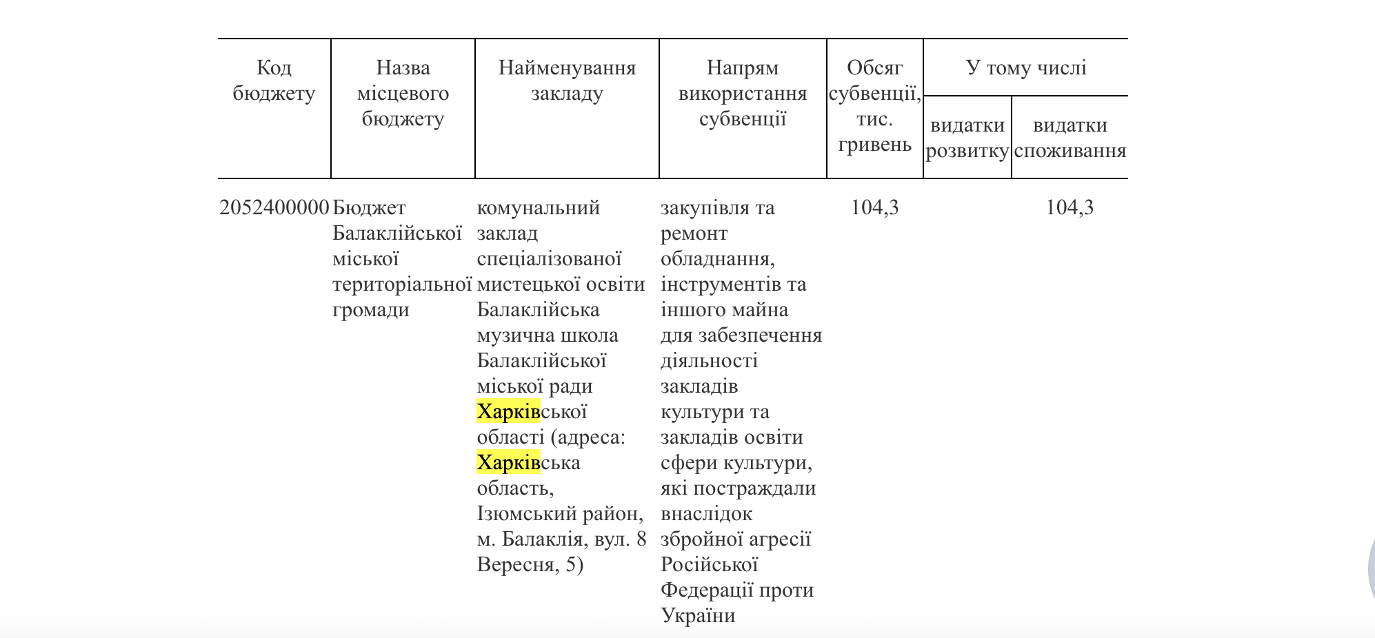 По данным из документа, Кабмин решил направить средства в поддержку заведений культуры, которые получили повреждения во время боевых действий. В частности, Балаклейская музыкальная школа получит 104,3 тыс. грн. на закупку нового оборудования, музыкальных инструментов и ремонт помещений.