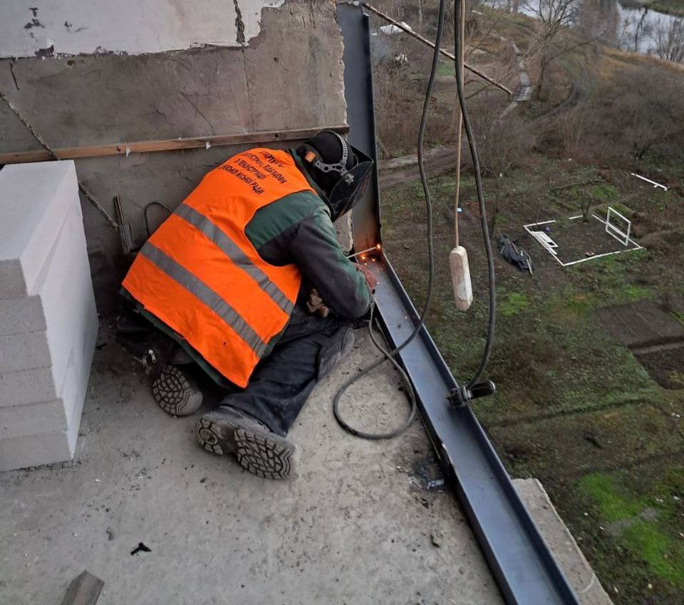 Специалисты выполняют монтаж металлоконструкций на балконах и восстанавливают ограждения из газоблоков.