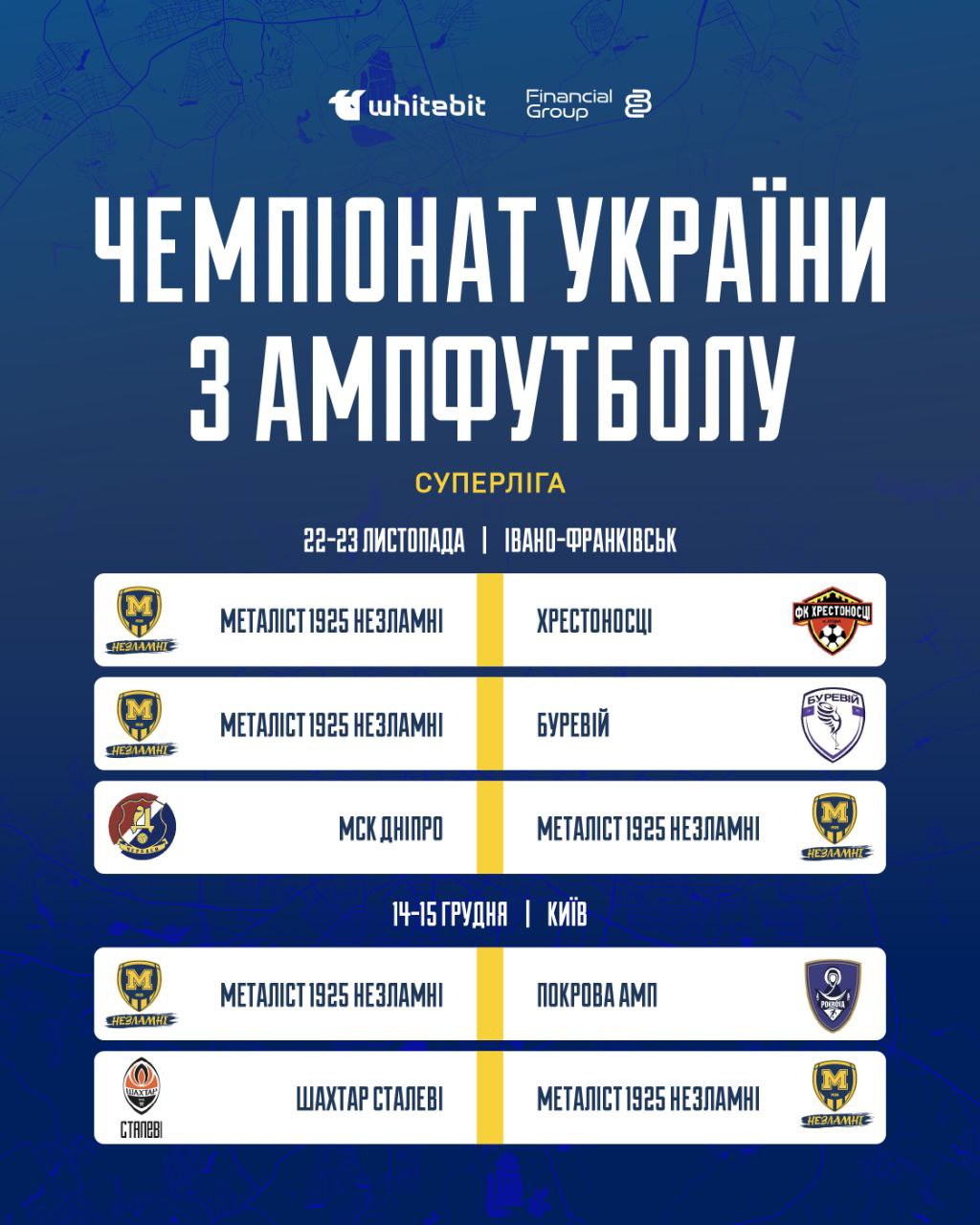 Пятый раунд запланирован на 14-15 декабря в Киеве, где "Металлист 1925 Несокрушимые" встретится с "Покровом АМП" и "Шахтером Сталевым".