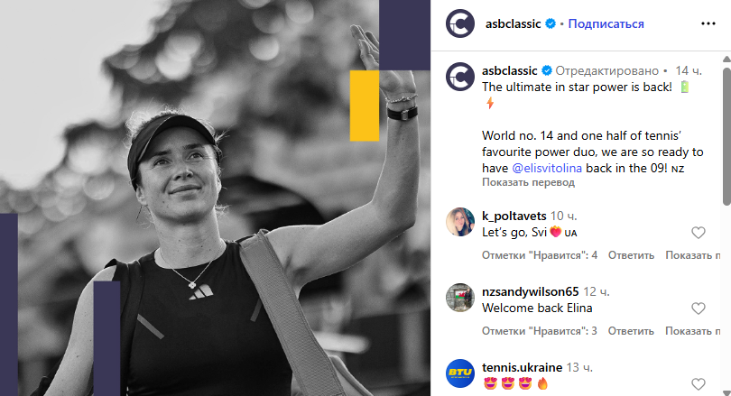Харьковская теннисистка Элина Свитолина подтвердила участие в турнире WTA 250 в Окленде, который станет стартом сезона-2026.
