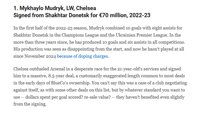 Вингер из Харьковской области Михаил Мудрик возглавил рейтинг самых неудачных трансферов в истории английской Премьер-лиги по версии ESPN.