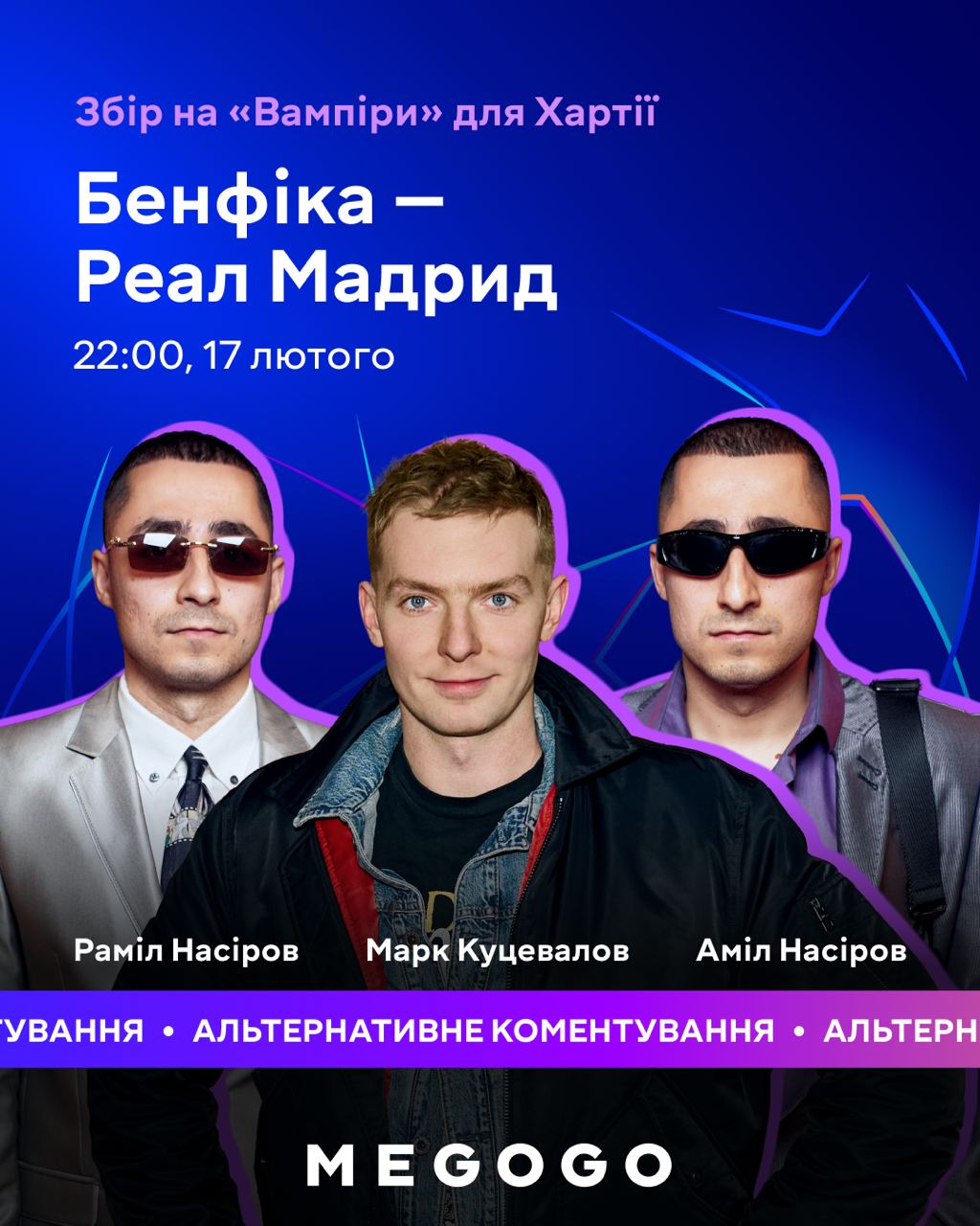 Матч будут комментировать Амил и Рамил Насировы — участники группы Курган & Agregat из Харьковской области — вместе с Марком Куцеваловым. Цель сбора - 1 млн грн на тяжелые дроны Vampire для подразделения "Хартия", которое выполняет задачи на Купянском направлении.
