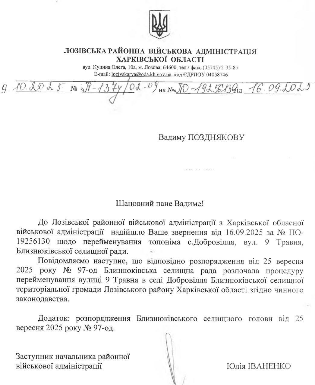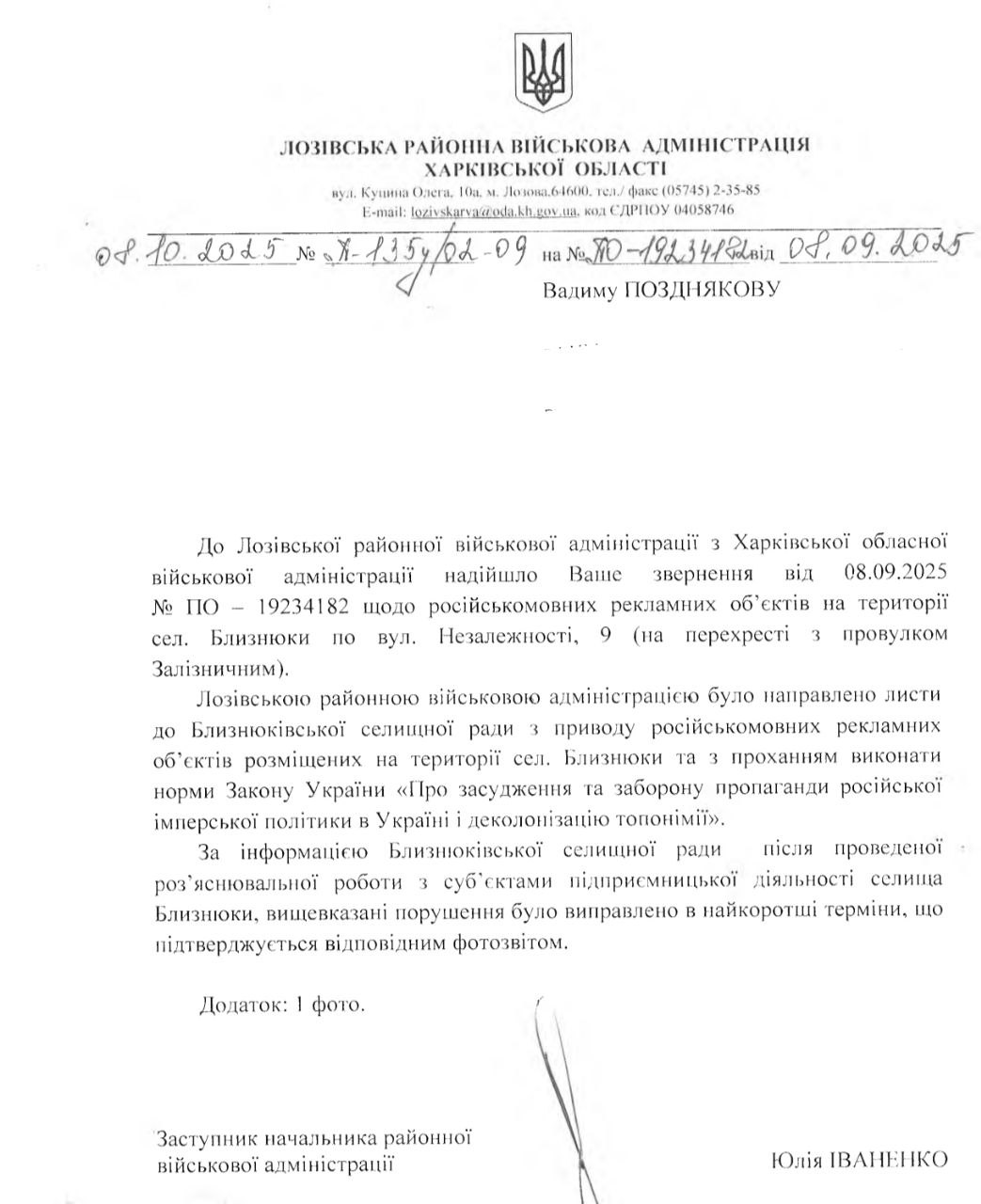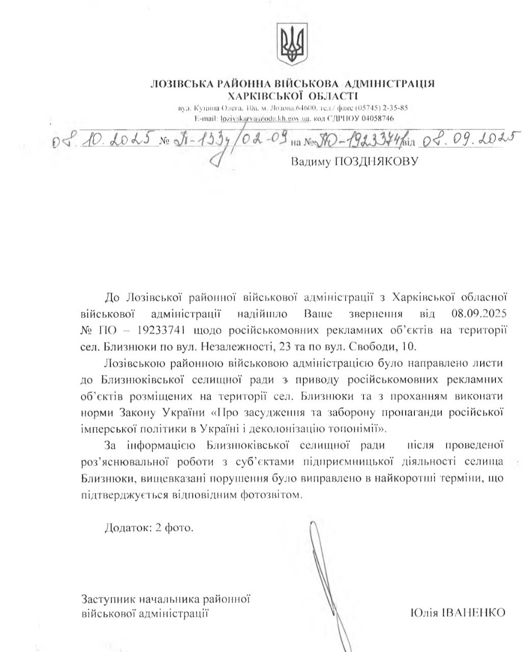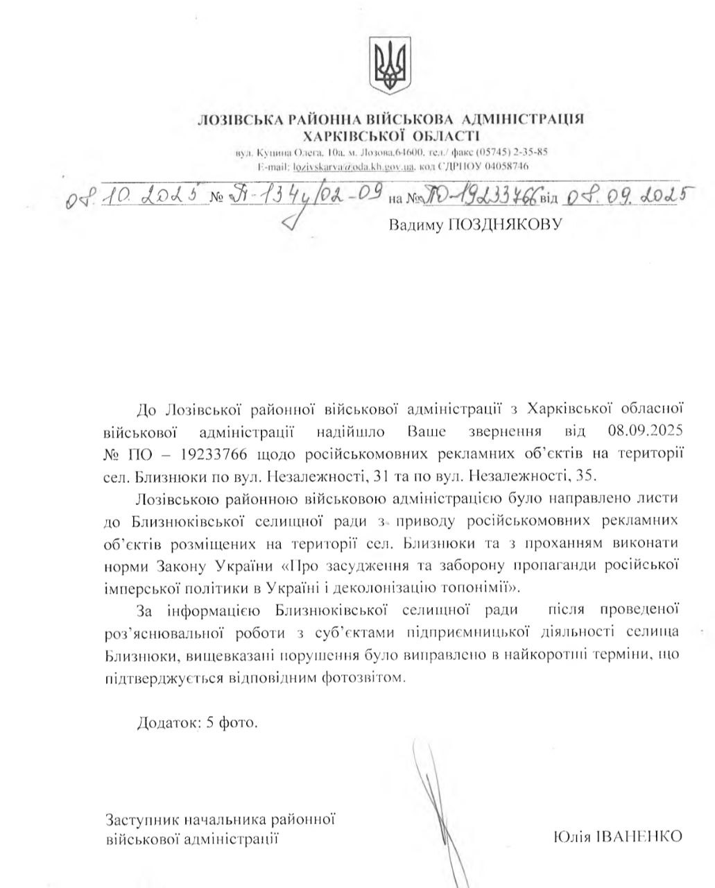 Лозовская районная военная администрация подтвердила, что после проверки Близнюковский поселковый совет провел разъяснительную работу с предпринимателями. В результате все надписи, нарушавшие закон о деколонизации, были убраны.