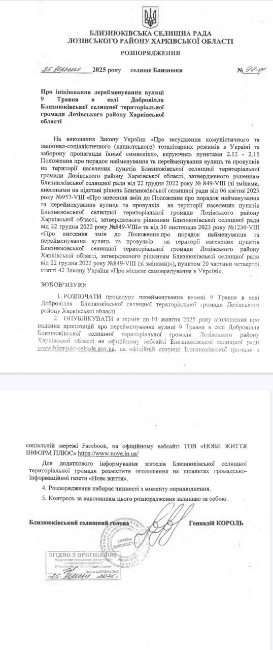 Кроме того, громада начала процедуру переименования улицы 9 Мая в селе Доброволье. Соответствующее распоряжение было принято 25 сентября, а новое название выберут после публичного обсуждения.