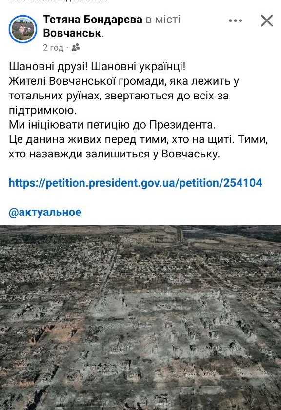 Автор петиции подчеркивает, что Волчанск является пограничным городом, который с первых дней войны стал щитом для всей Харьковщины.