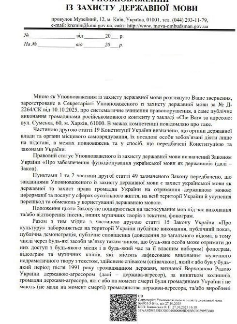 По данным активистов, в Харькове заведение "Che Bar" на улице Сумской попало в поле зрения уполномоченного по защите государственного языка. Причина – регулярное исполнение российских песен в караоке, что вызвало обращение в ГУ Национальной полиции в Харьковской области.