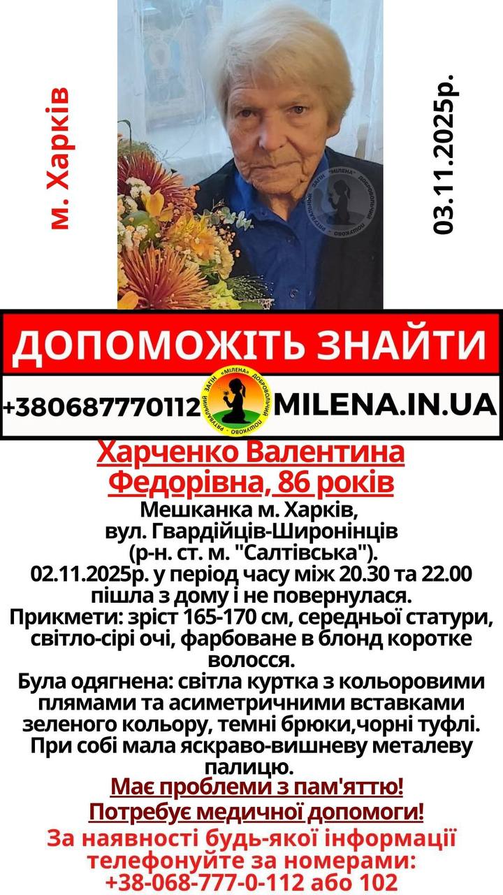 По информации ПРЗ, в Харькове исчезла 86-летняя Валентина Харченко. По данным поисково-спасательного отряда "Милена", женщина вышла из дома на улицы Гвардейцев-Широнинцев (район станции метро "Салтовская") 2 ноября между 20:30 и 22:00 и больше не вернулась.