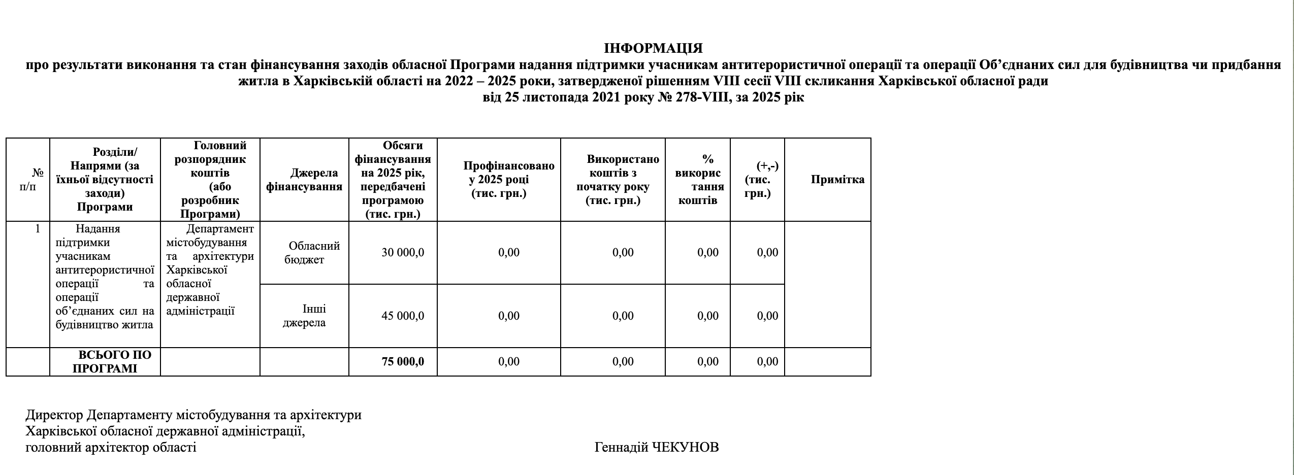 По информации из документа, Харьковский областной совет вынес на следующую сессию проект решения по выполнению программы поддержки участников АТО/ООС в строительстве и приобретении жилья, действующей с 2022 года. В то же время в пояснительных документах отмечено: в 2025 году эта программа не получила финансирования, несмотря на запланированные 75 млн грн.
