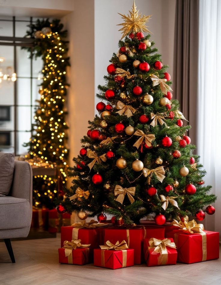 Красный и золотой – вечные цвета Нового года, но в 2026 году они могут выглядеть более благородно. Вместо яркого красного – глубокий бордо, вместо золота – мягкий золото-перламутр. В моде большое количество лент, бархатные банты, стеклянные или зеркальные шарики.