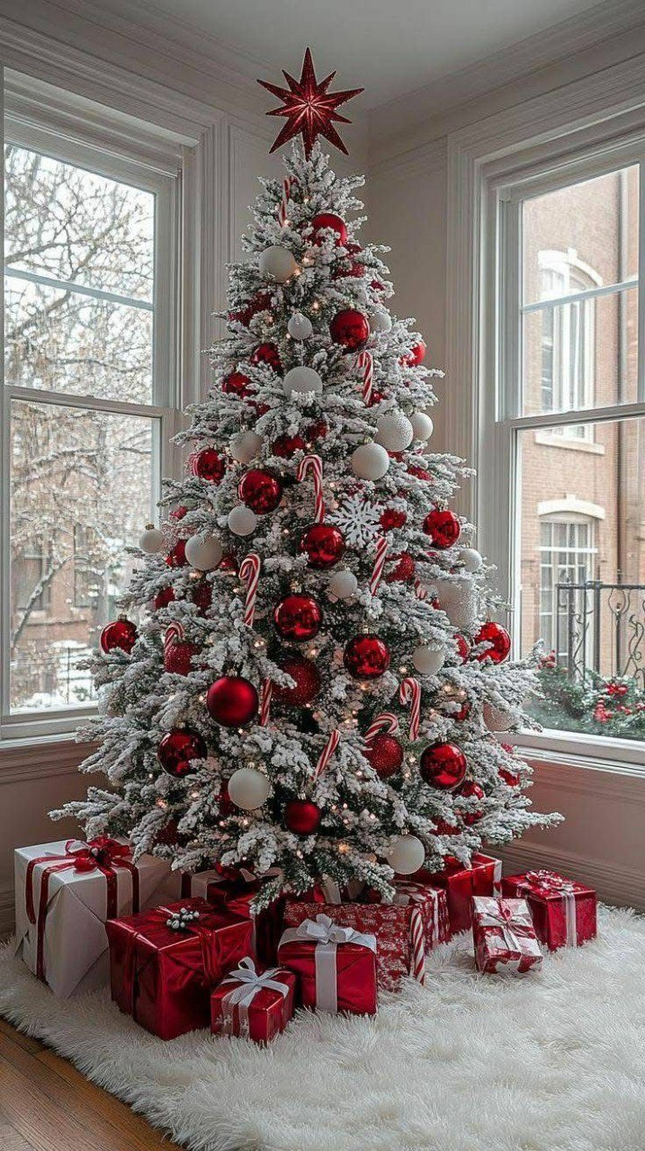 Тем, кто любит более выразительный контраст, подойдет сочетание красного и белого оттенков. На заснеженных ветвях это выглядит еще более эффектно и стильно.