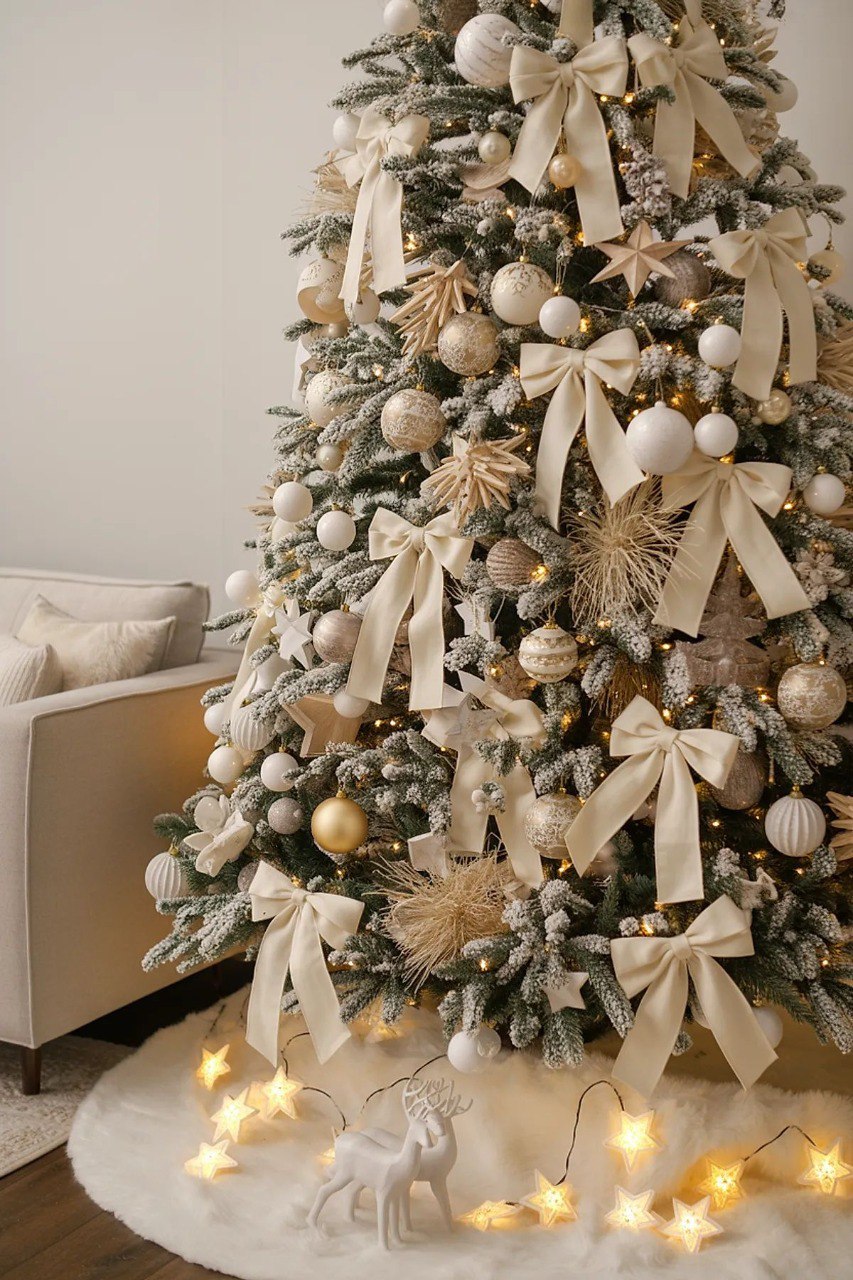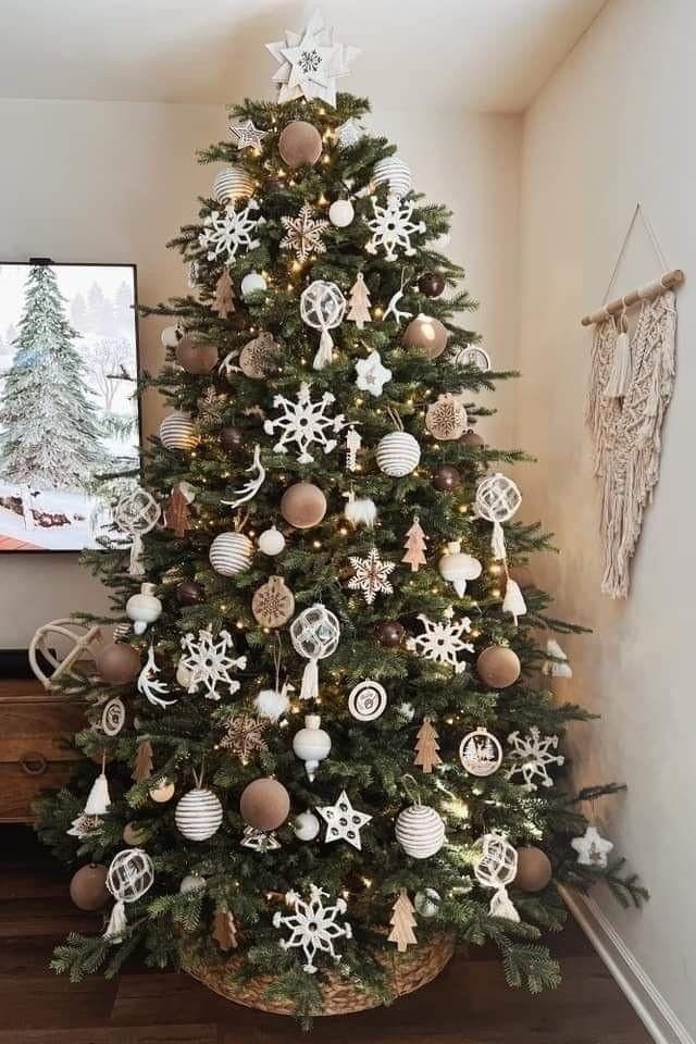 Если же хочется тихого, домашнего тепла, можно сделать ставку на бежевую гамму, а сверху добавить бумажные украшения, меховые элементы, серебряные детали или морозные шарики.