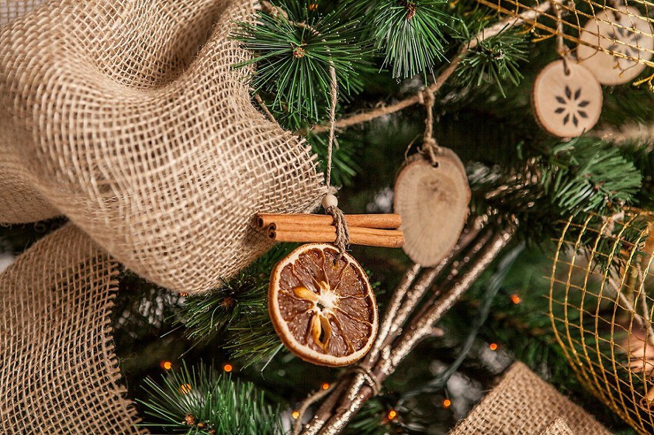 Этот стиль остается на пике популярности. Он ассоциируется с теплом, домашними и спокойствиями. Такую елку украшают деревянными подвесками, фетровыми фигурками, шишками, джутовыми элементами, соломенными звездами и даже сушёными апельсинами. Цветовая гамма – теплая, естественная: зелень, бежевые цвета, карамель, медовый, белоснежный. Все светится приглушенно и мягко, без чрезмерного блеска.