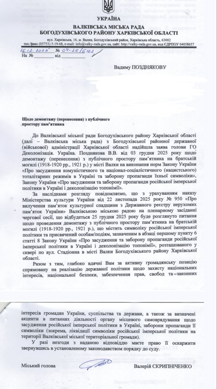 Кроме того, 25 декабря в Валках планируется официально рассмотреть вопрос демонтажа памятника "Борцам за власть советов". Именно это решение может стать очередным шагом в процессе очищения публичного пространства Харьковской области от советского наследия.