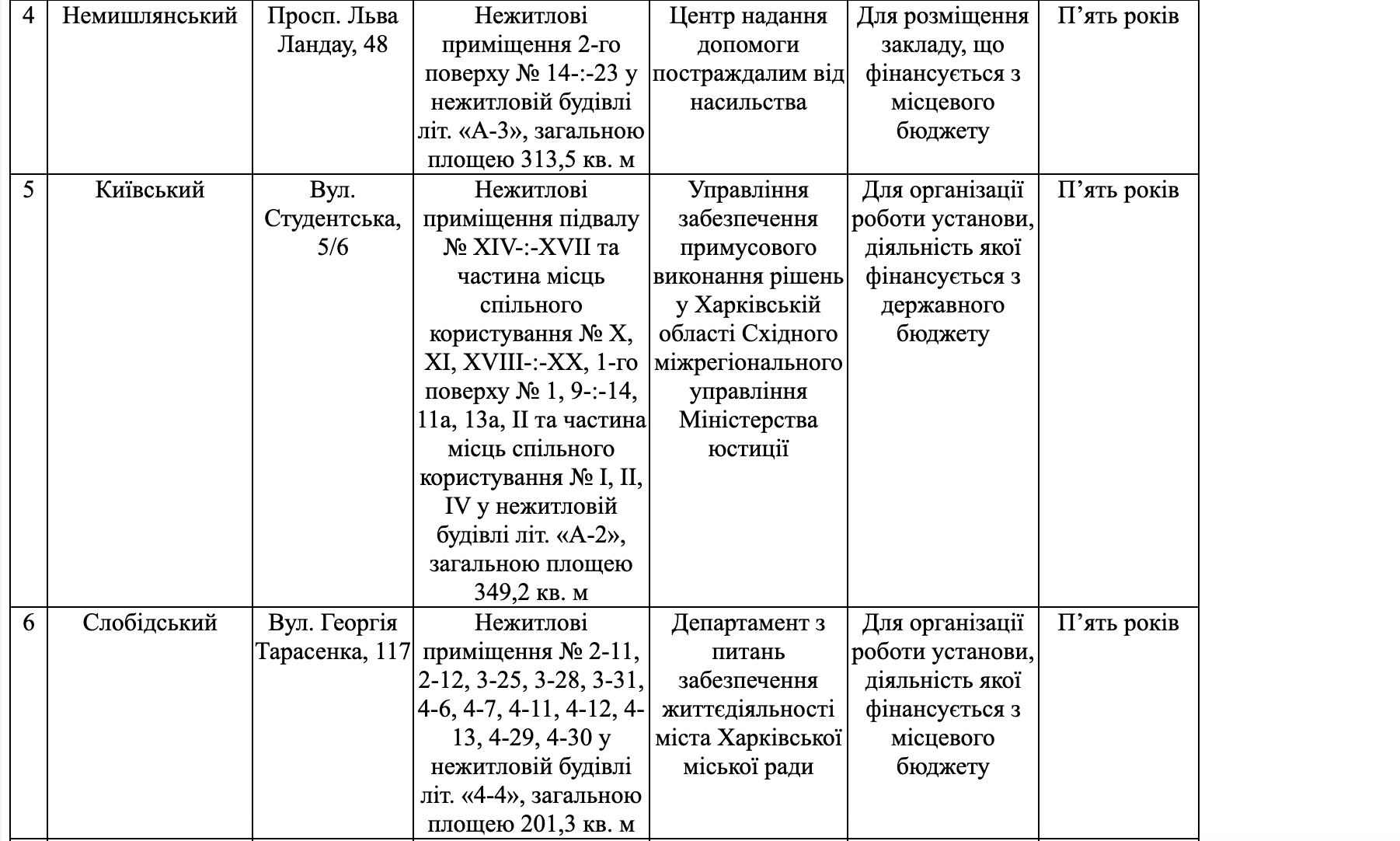 Согласно решению, в аренду передаются девять объектов в Салтовском, Немышлянском, Киевском, Холодногорском, Слободском и Новобаварском районах города. Общая площадь помещений составляет около 1.7 тыс. кв.