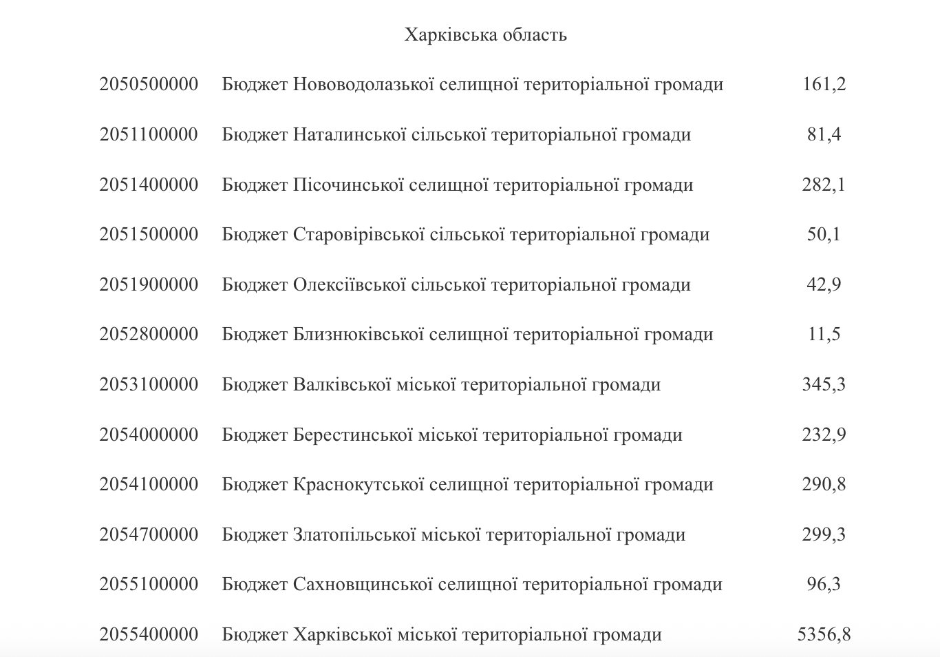 В Харьковской области средства получат 12 общин. Наибольший объем – 5,36 млн грн – выделен Харьковской городской общине. Среди других – Песочинская поселковая община получит 282,1 тыс. грн, Краснокутская – 290,8 тыс. грн, Златопольская – 299,3 тыс. грн, Нововодолажская – 161,2 тыс. грн. Меньшие общины получат от 11,5 до 96,3 тыс. грн.