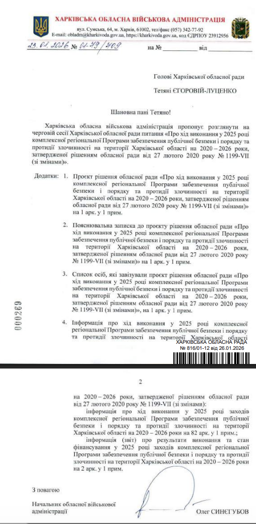 По данным из документа, Харьковский областной совет рассмотрит проекты решений по дальнейшей реализации двух региональных программ безопасности, по выполнению которых в 2025 году отчиталась областная военная администрация.