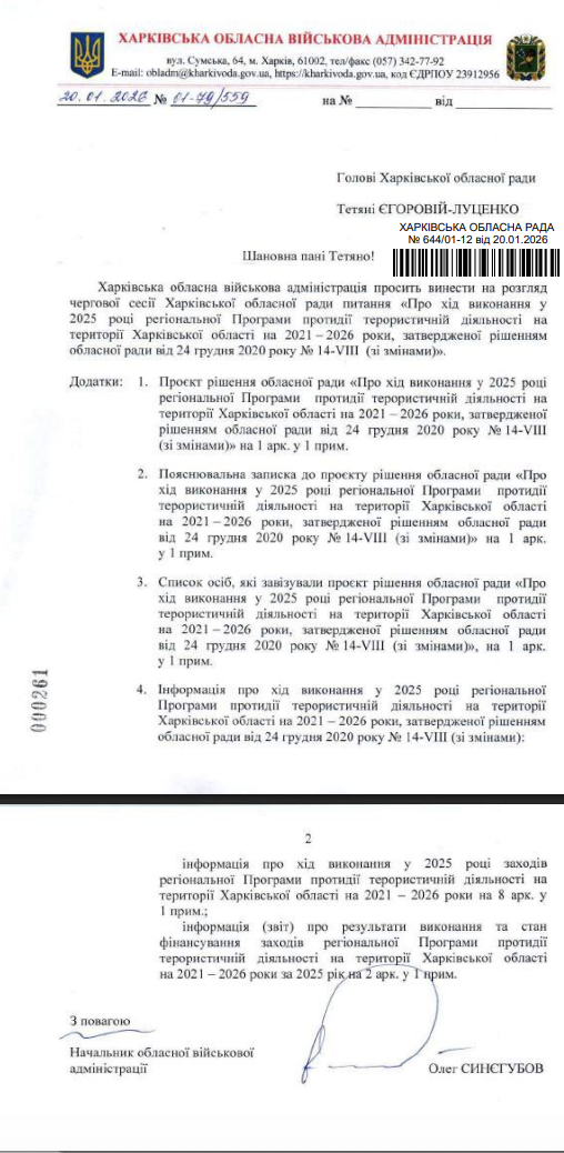 Второй проект решения предусматривает принятие в известность информации о выполнении в 2025 году региональной Программы противодействия террористической деятельности на территории Харьковской области на 2021–2026 годы. Документ также предлагает продолжить работу по ее реализации.