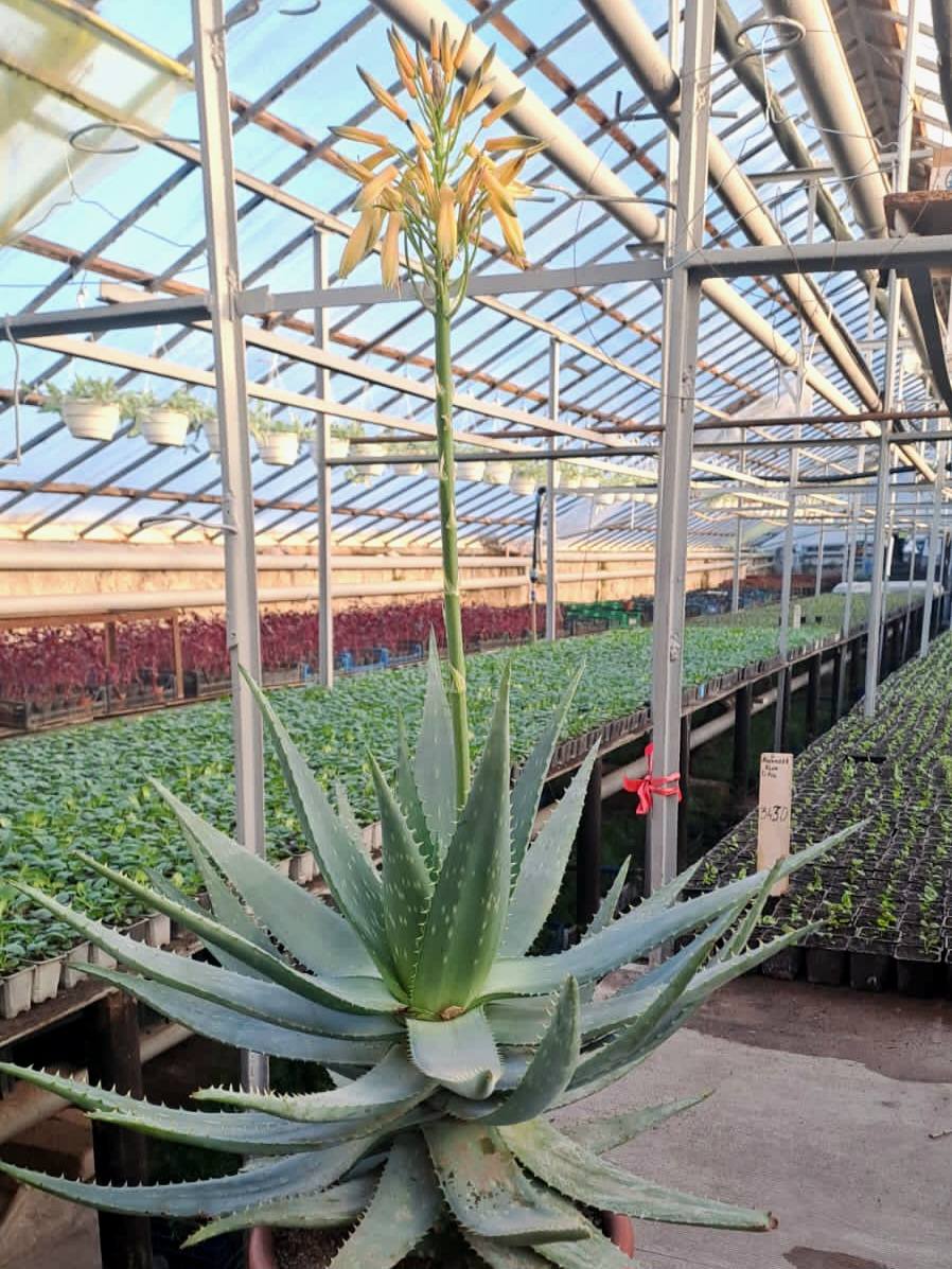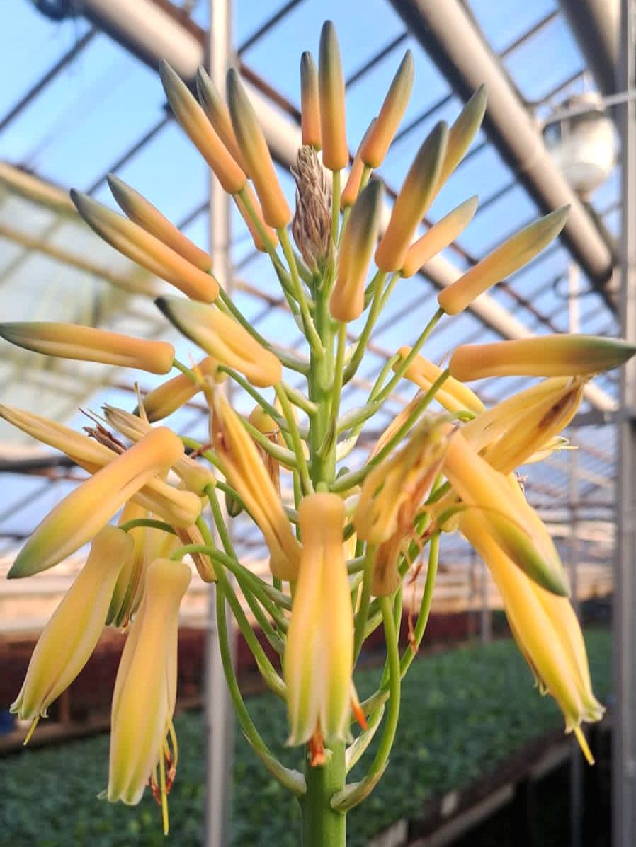 Специалистам предприятия удалось создать для нее условия, близкие к африканской пустыне, и алоэ отблагодарило длинную стрелку с желтыми колокольчатыми цветками.