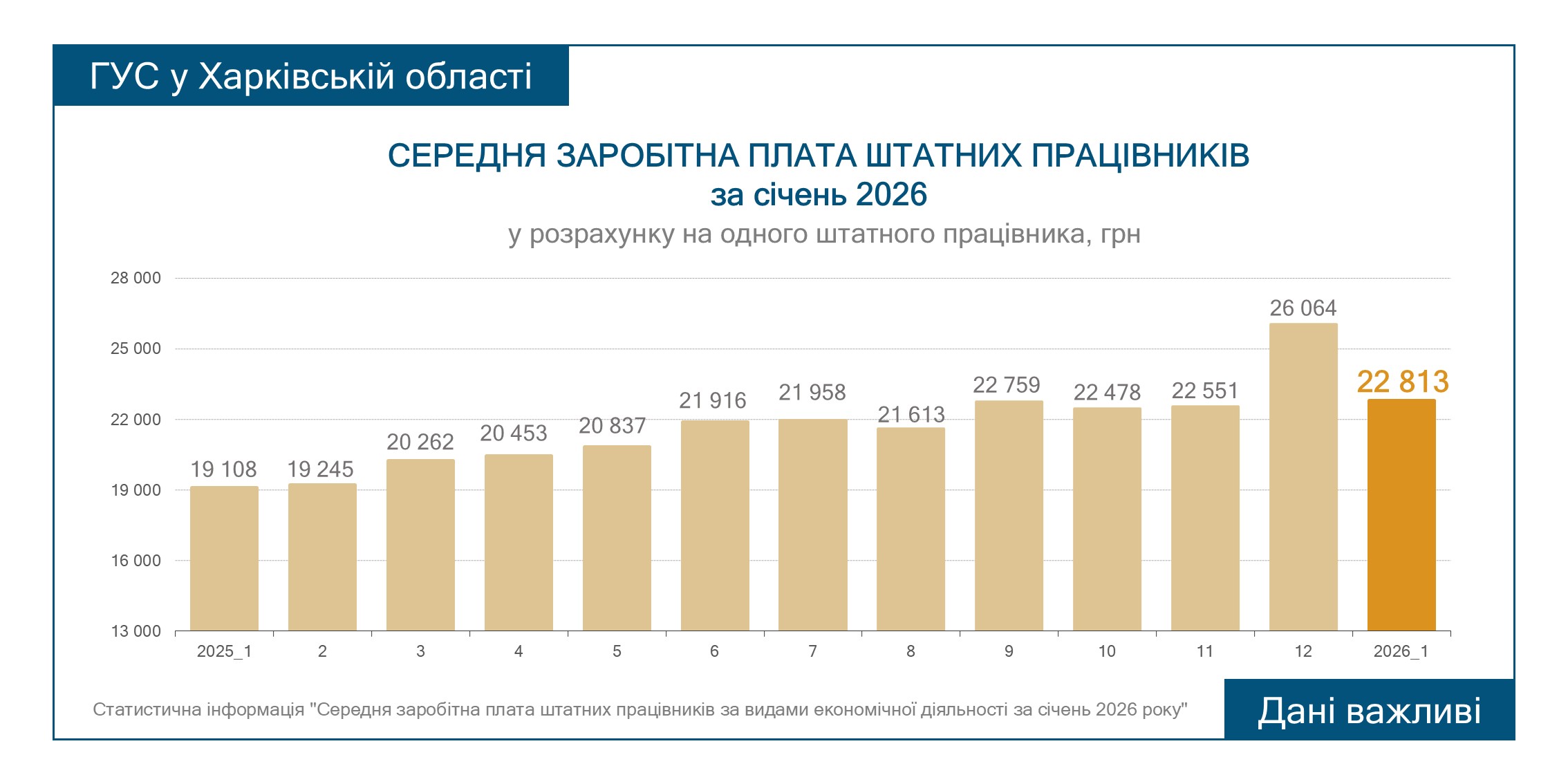В январе 2026 средняя заработная плата штатных работников в Харьковской области составила 22 813 грн.