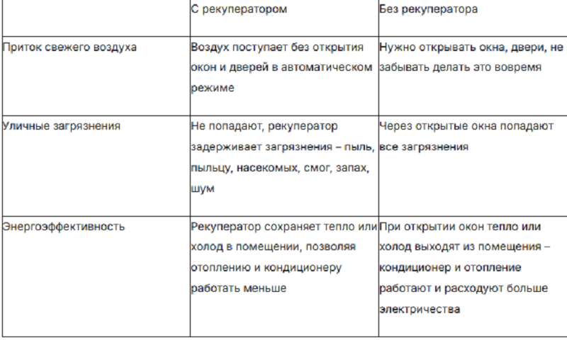 Таблица ниже поможет вам представить преимущества рекуператора: