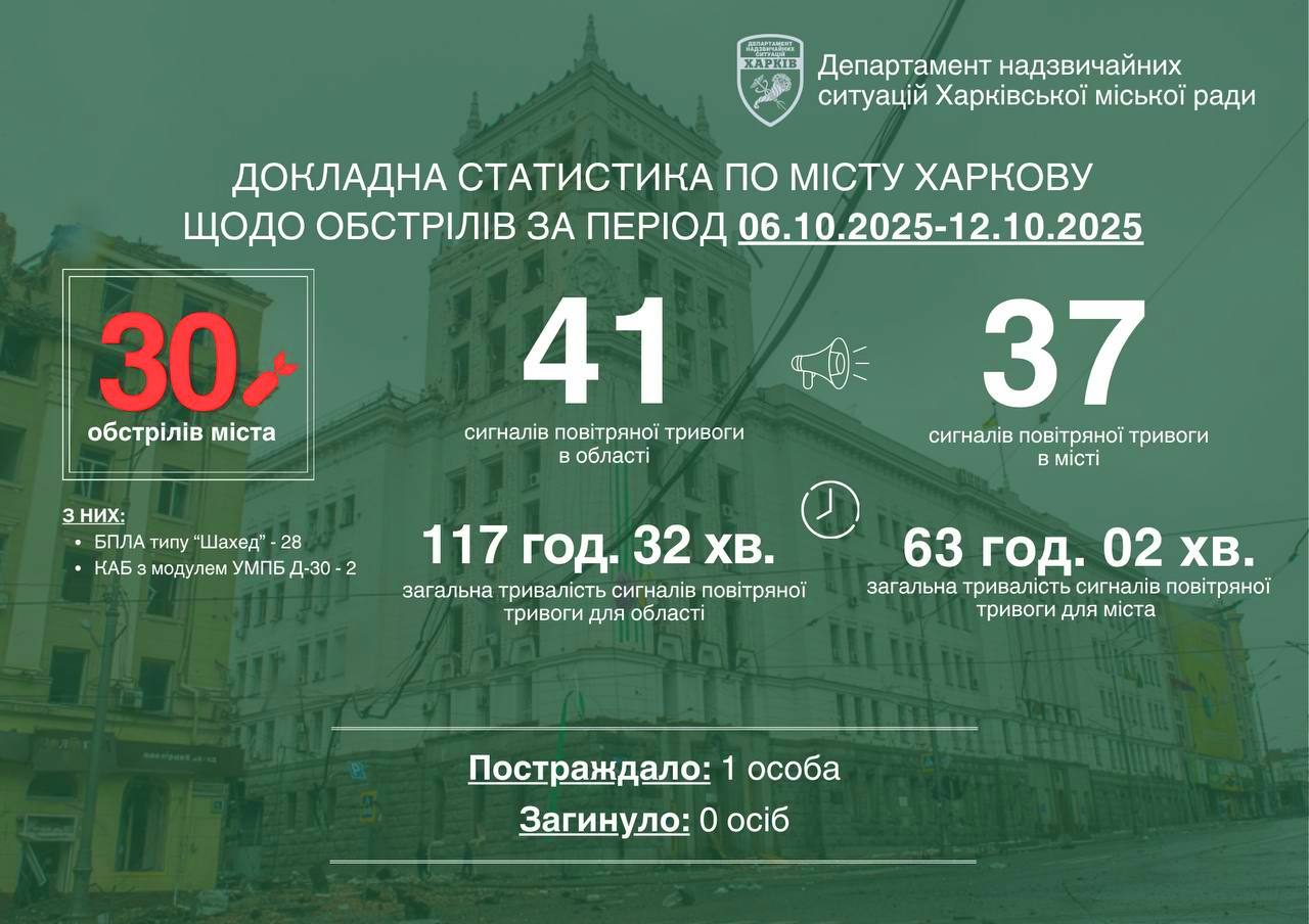 Ситуационный центр зафиксировал попадание в Немышлянском, Шевченковском, Слободском и Индустриальном районах города. Средняя продолжительность воздушных тревог в Харькове была меньше на 54 часа (47%), чем в области.