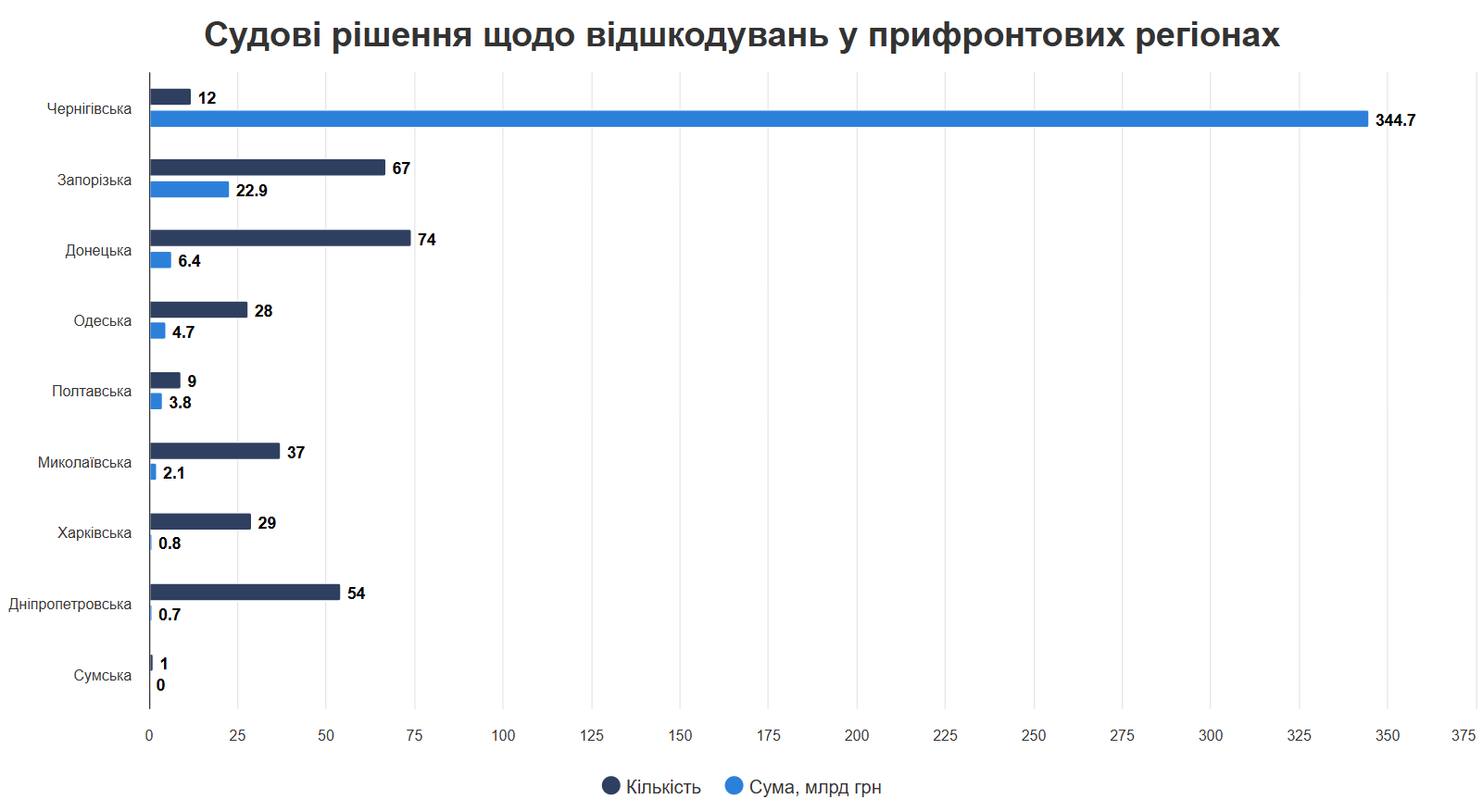 По данным аналитиков, украинские суды обязали РФ выплатить 386,03 млрд грн убытков компаниям из прифронтовых регионов.