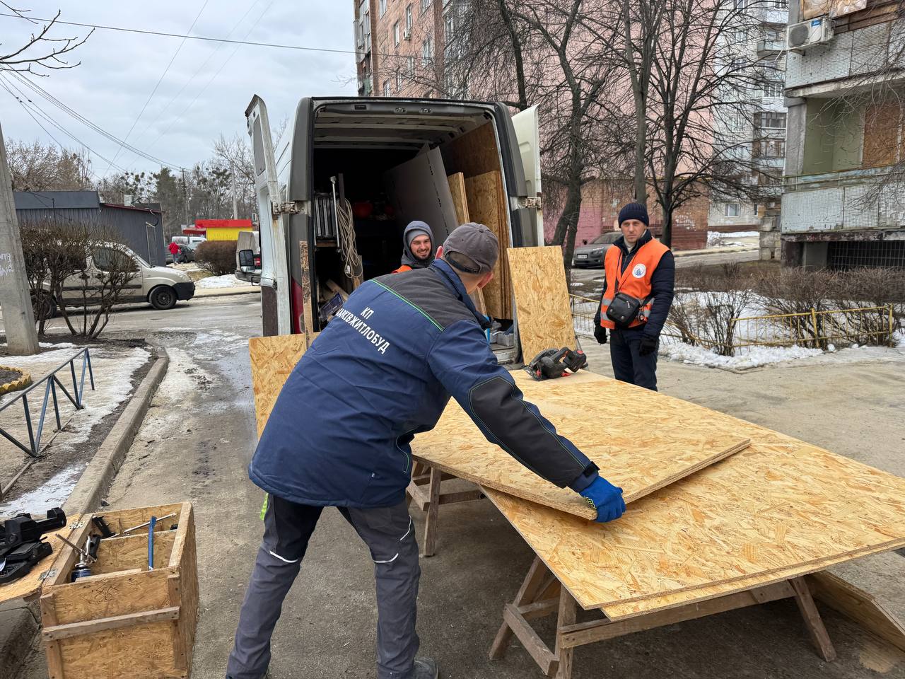 В Киевском районе специалисты уже закрыли более 470 окон, что составляет 50% от общего количества выбитых.