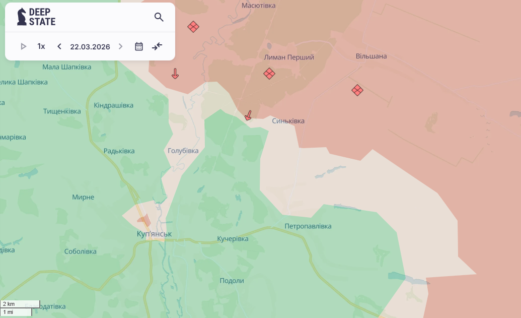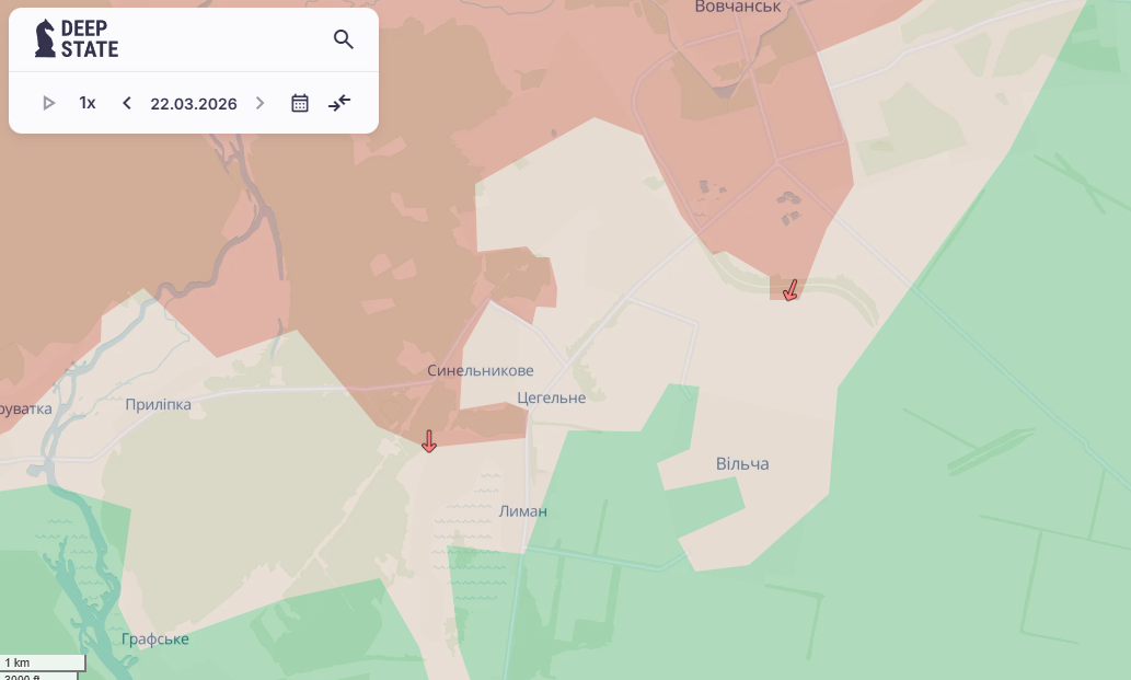 По данным Deep State, вчера, 22 марта, стало известно, что враг продвинулся в Волчанске и в Синьковке Харьковской области.