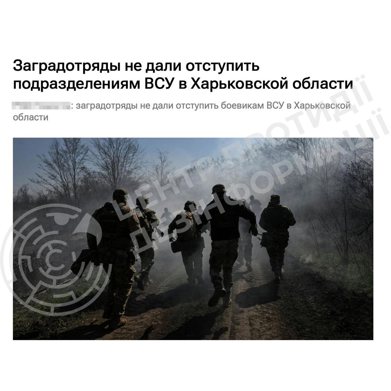 По данным ЦПД, на этот раз россияне распространяют фейк, якобы подразделения НГУ исполняют роль "загонов" вблизи села Зыбино Харьковщины, не давая бойцам 113-й бригады ТрО покидать позиции.