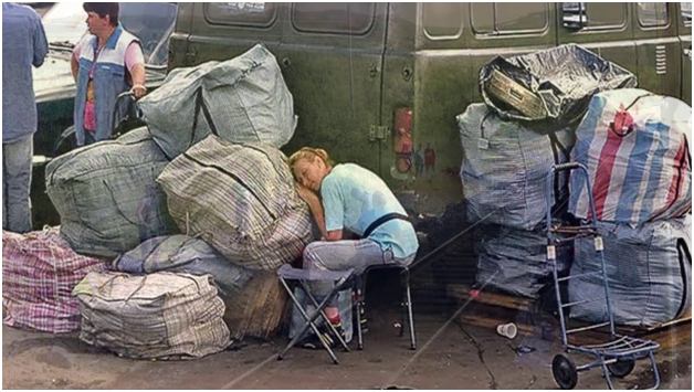 "Вийшли з тіні" – досить умовний вираз для тих обставин, оскільки торгівля розпочиналася близько 23:00 та тривала до ранку. Торгували вночі, бо вдень працював офіційний ринок. Весь "рух" відбувався на тому місці, де зараз стоять ряди з будматеріалами, "залізяки". Жодних прилавків чи навіть лотків не було – все продавали з рук. Не було навіть організованих рядів та якогось порядку, продавці ставали десь могли, а між ними блукали покупці.