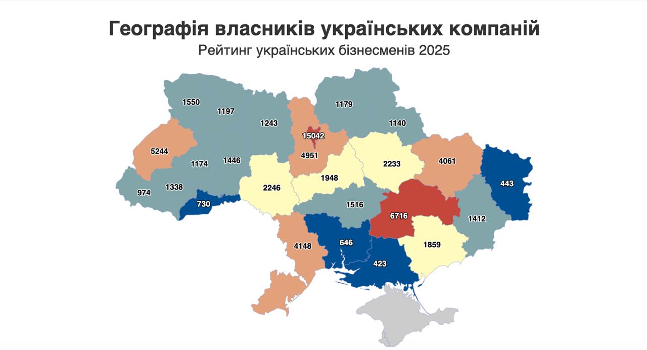 Найменша концентрація великого бізнесу зафіксована у прифронтових регіонах — Луганській, Херсонській та Миколаївській областях, де частка таких підприємців не перевищує 1%.