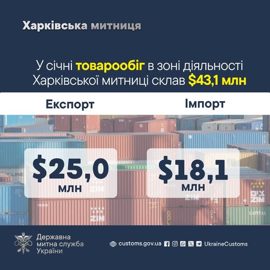За даними митників, у січні 2026 року загальний товарообіг у зоні діяльності Харківської митниці склав майже $43,1 млн, що на $2,6 млн більше, ніж у січні 2025 року ($40,5 млн).