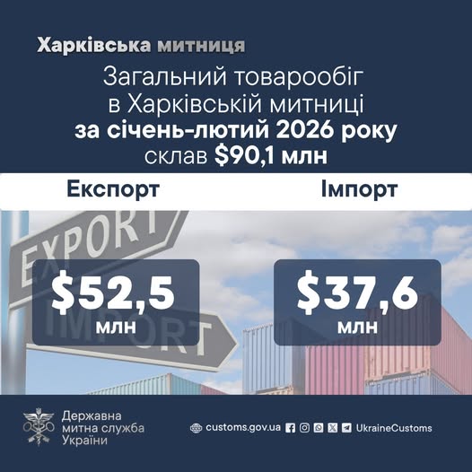За даними митників, у січні–лютому 2026 року в зоні діяльності Харківської митниці зафіксували зовнішньоекономічні операції на суму 90 млн доларів США.