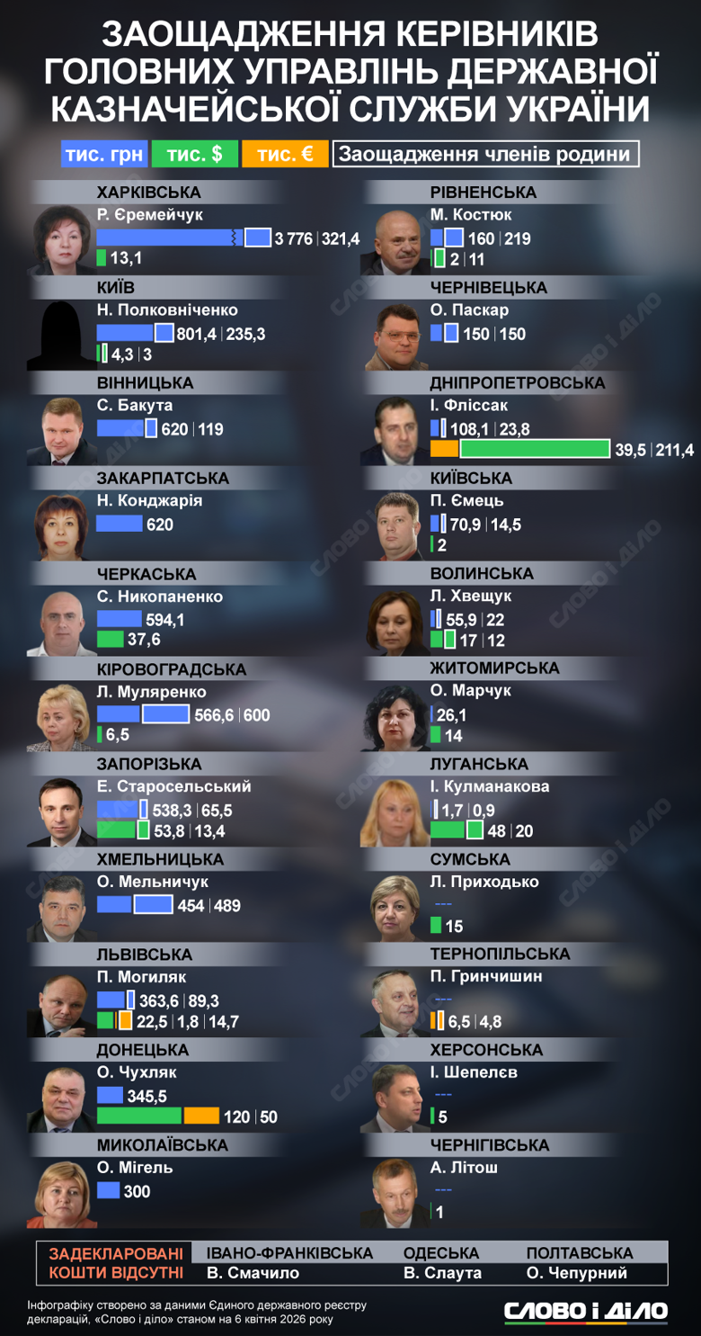 Для порівняння, найближчі показники в інших регіонах значно нижчі: керівниця столичного управління задекларувала близько 801 тис. грн і 4,3 тис. дол., а очільники у Вінницькій та Закарпатській областях – по 620 тис. грн кожен.