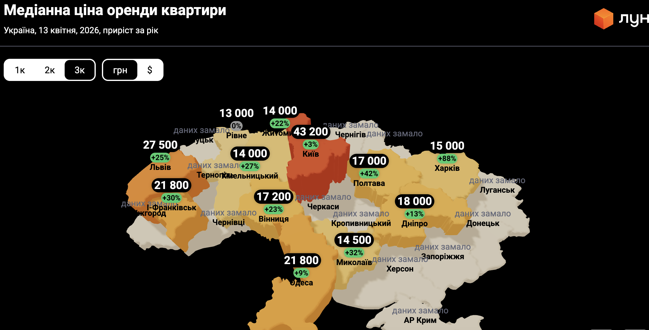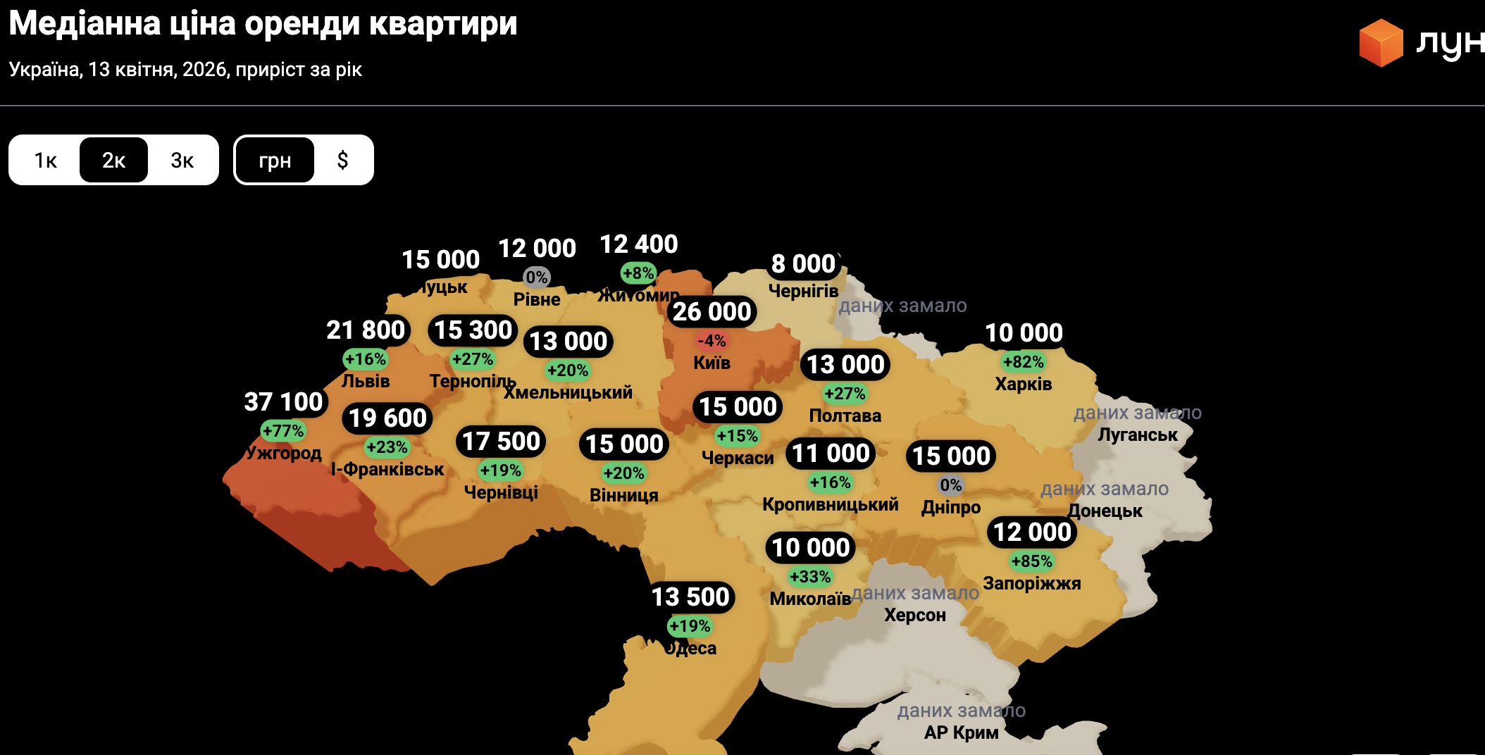 Попри таке зростання, Харків залишається містом із найдешевшою орендою серед великих обласних центрів. Для порівняння, в Ужгороді середня ціна сягає 21,8 тис. грн, у Львові – 17,9 тис. грн, Івано-Франківську – 17,5 тис. грн, у Києві – 17 тис. грн.
