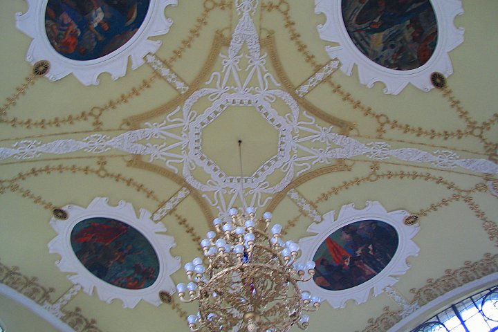 Довідка. Інтер’єр головного залу вокзалу містить низку плафонів у стилі соцреалізму. Серед них — "Шахтарі" та "Урожай", авторство яких приписують Івану Радоману, а також "Перемога" і плафон із зображенням заводу, схожого на Харківський турбінний, які пов’язують з Євгеном Лансере-молодшим.