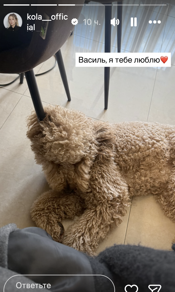 Але далі було цікавіше. За кілька годин після студії співачка KOLA опублікувала власне відео, де біля неї відпочиває той самий Василь. Свій сторіс вона підписала так: "Василь, я тебе люблю".