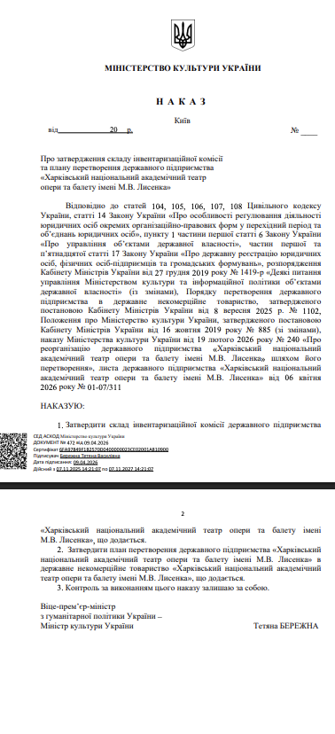За даними з документа, Міністерство культури України запустило процес перетворення Харківського національного академічного театру опери та балету імені Миколи Лисенка. Відповідний наказ підписала міністерка Тетяна Бережна.