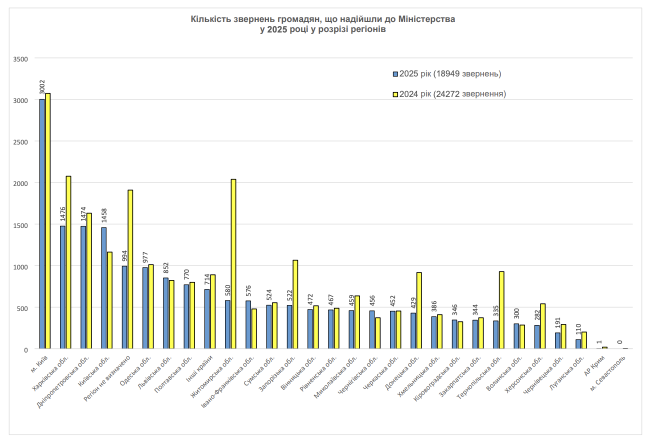За статистикою, найбільше звернень надходило з м. Києва — 3002, Дніпропетровської області — 1474, Київської області — 1458. Водночас у інших областях, таких як Житомирська, Тернопільська та Донецька, зменшення звернень перевищувало 50%.