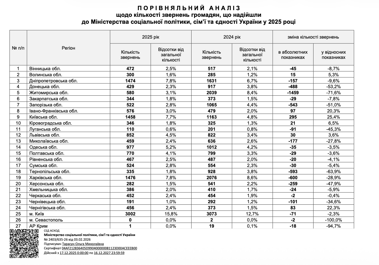 За даними міністерства, у 2025 році до Міністерства соціальної політики надійшло 1476 звернень від мешканців Харківської області, що становить 7,8% від загальної кількості звернень по Україні. Порівняно з 2024 роком, кількість звернень з регіону скоротилася на 600 випадків, або на 28,9%.