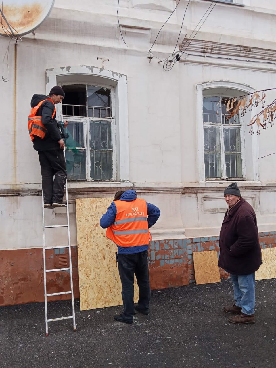 Комунальники прибирають бите скло та габаритне сміття, а також впорядкують прилеглі території. Бригади КП "Харківспецбуд" закриває контури будинків, а фахівці КП "Житлокомсервіс" обстежують пошкоджені будинки та консультують мешканців щодо отримання компенсацій.