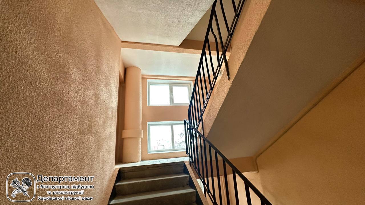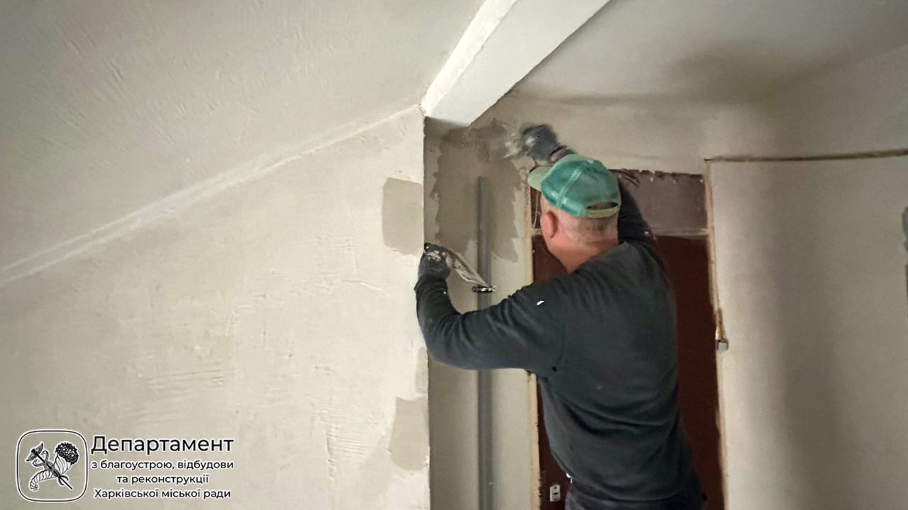 У Салтівському районі Харкова триває відновлення багатоквартирного житлового будинку, пошкодженого під час ворожих обстрілів у березні 2022 року.
